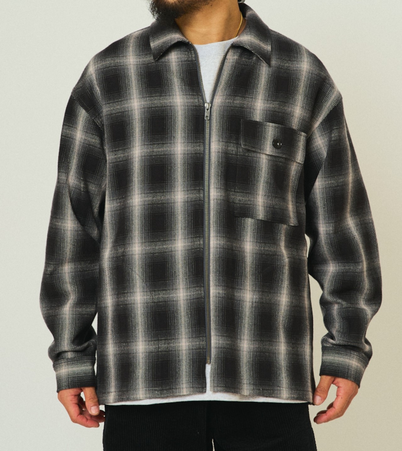 【BIG MIKE】肉厚でタフなフランネル生地を採用したジップ仕様のシャツジャケット。シャツの軽快さとジャケットの存在感を融合させた“いいとこ取り”のデザインで、秋冬のライトアウターからインナー使いまで幅広く対応します。