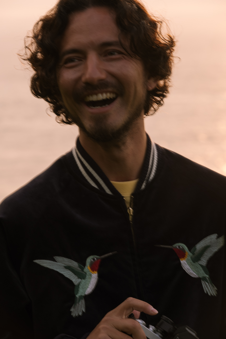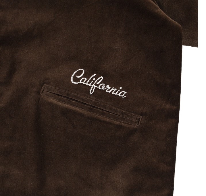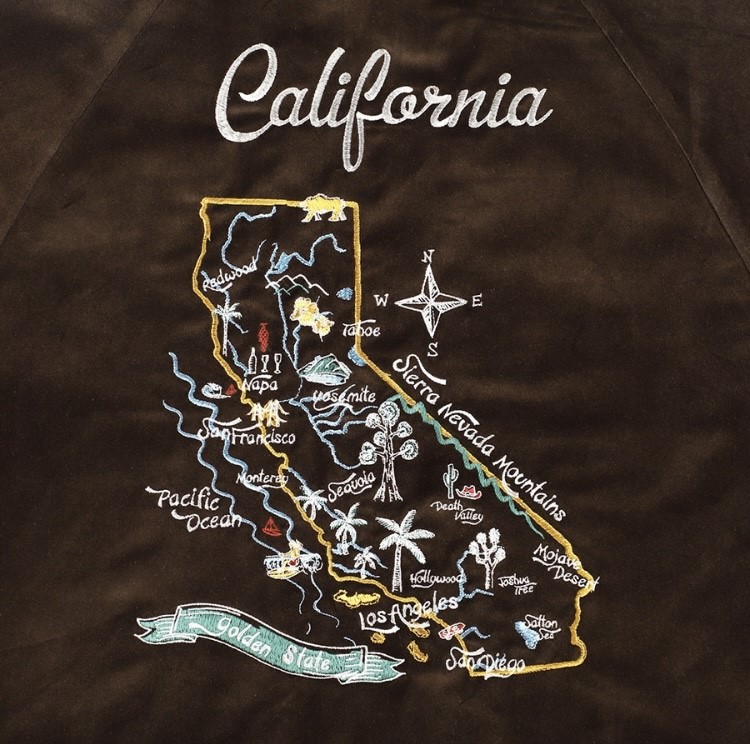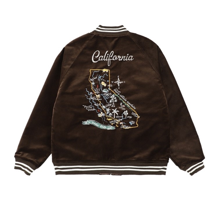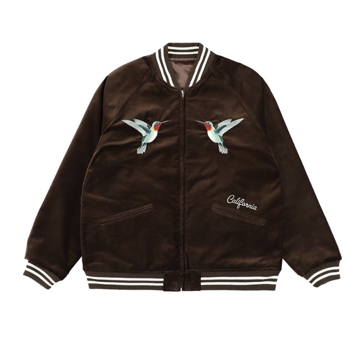 別珍とサテンのリバーシブル仕様で、別珍面は平和で穏やかな雰囲気のカリフォルニアをイメージし、フロントにはハミングバード、バックにはカリフォルニアマップを刺繍。
