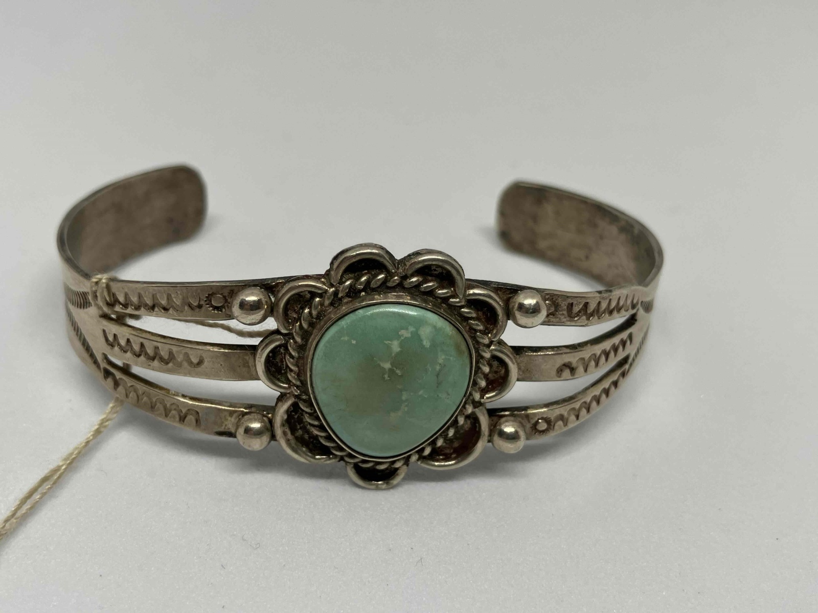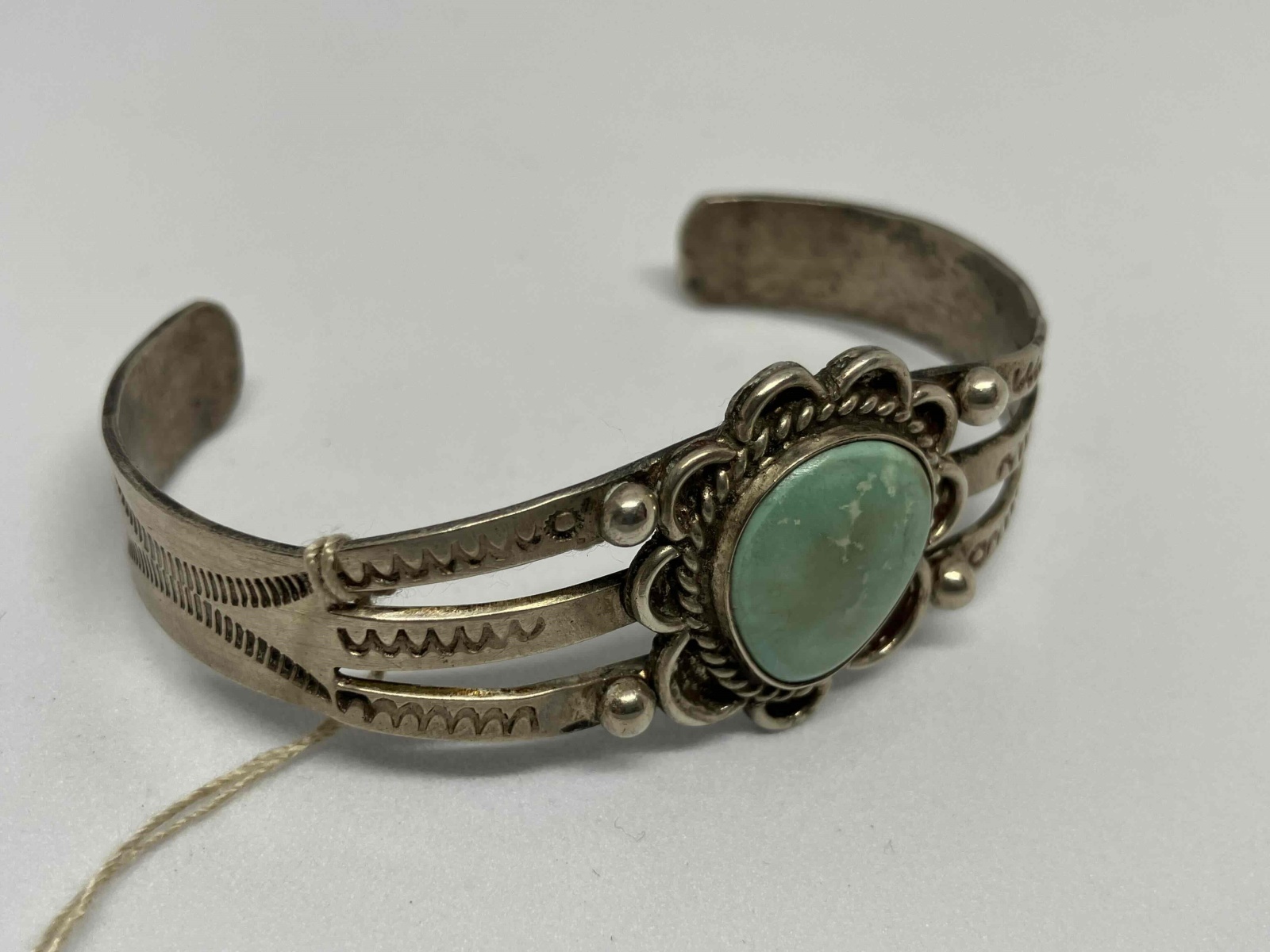 インディアンジュエリーの中でもファンが多く人気の高いフレッドハーヴィー期のバングルになります。ティファニーが買い取った鉱山として知られるニューメキシコ州ロス セリロス(Los Cerrillos)の鉱山は、すでに閉山された鉱山で採掘されたセリロスターコイズを使用しており希少性が高いです。フレッドハーヴィー期のバングルは、RALPH LAURENでも取り扱われていたり、各方面からの人気も高く熱狂的なファンの多いアイテムです。